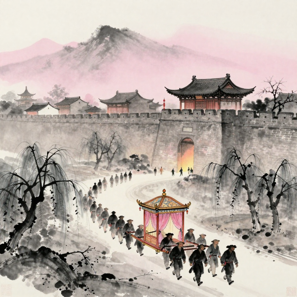 | figures-in-mist | Ink wash + soft watercolor tints | Marriages, courts, travelers, emotion |
