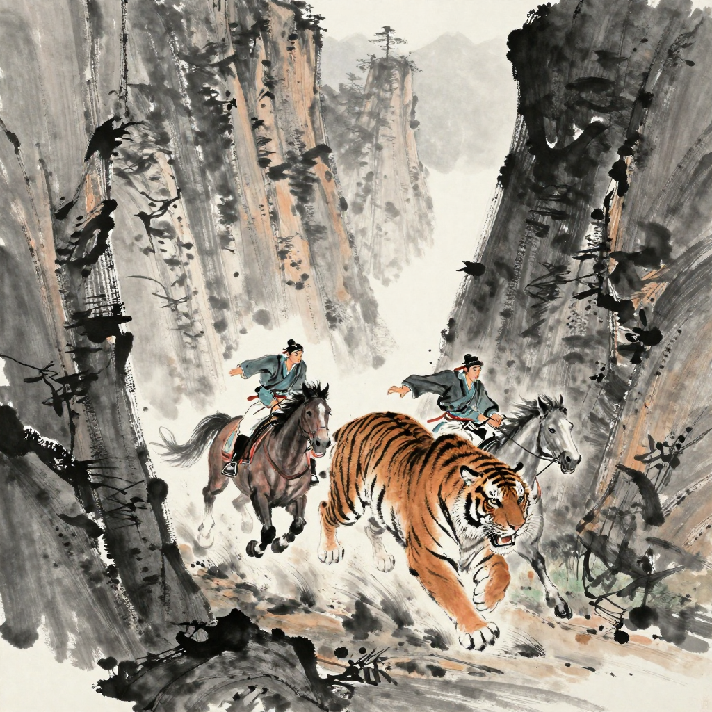 - Use painterly scene language — end with "Chinese ink painting." but embed painterly metaphors throughout. Never use photographic language.