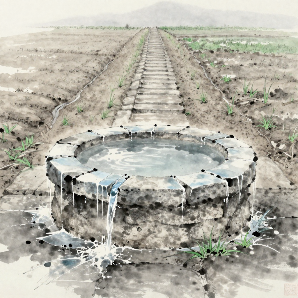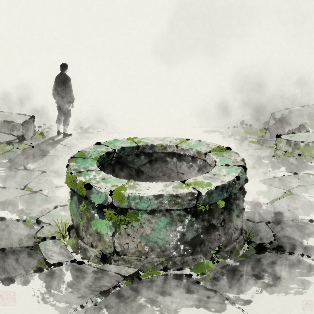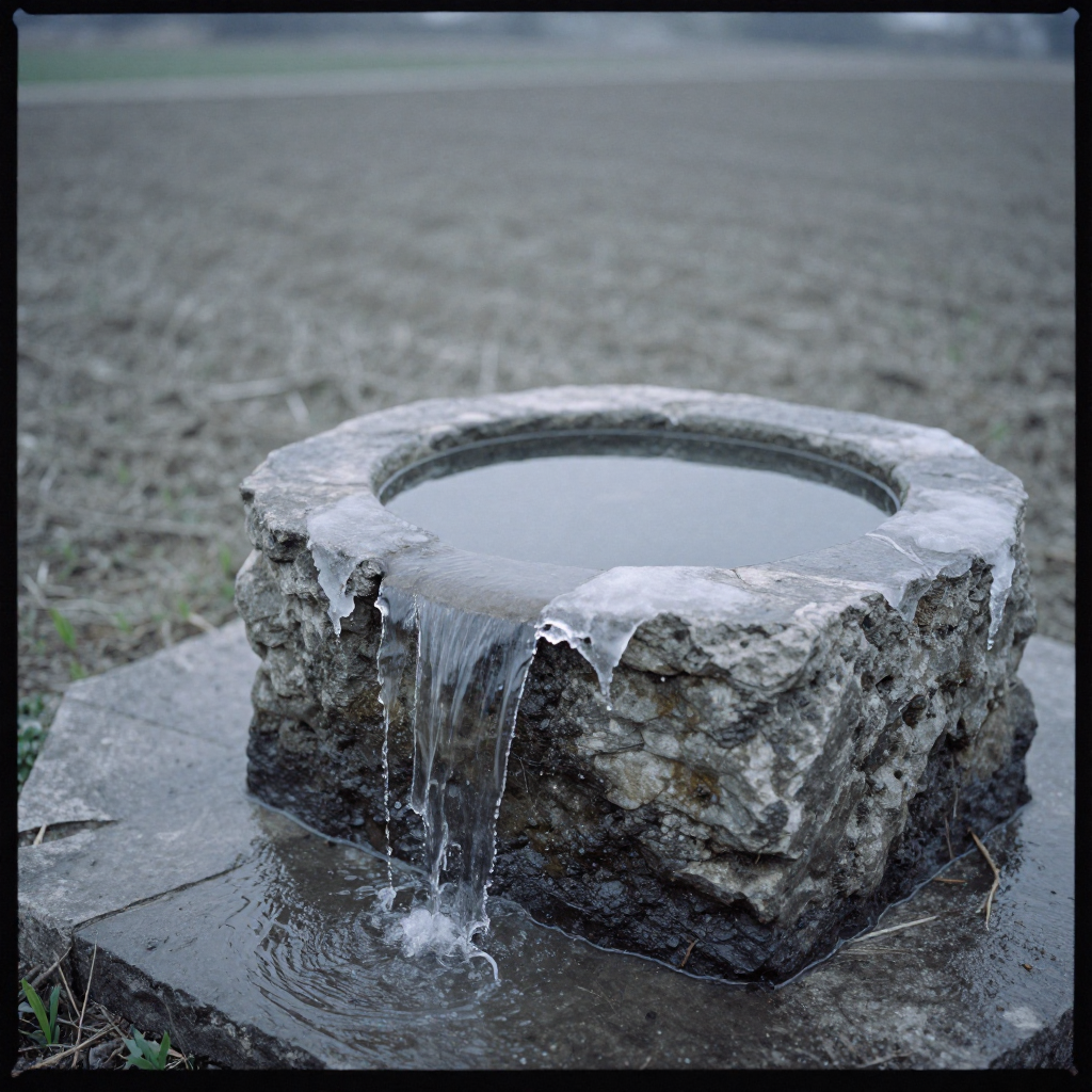 "…Water spills over the stone lip in thin silver threads, tracing dark lines down worn steps like brushstrokes on parchment…Chinese ink painting."