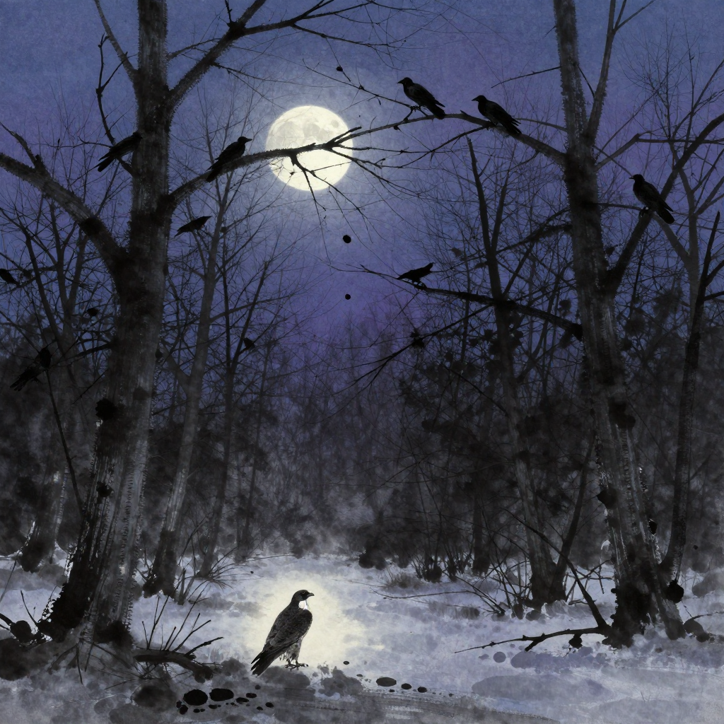 | Animal predation | "Scattered feathers on snow," "a wolf's shadow crossing moonlit ground" |
